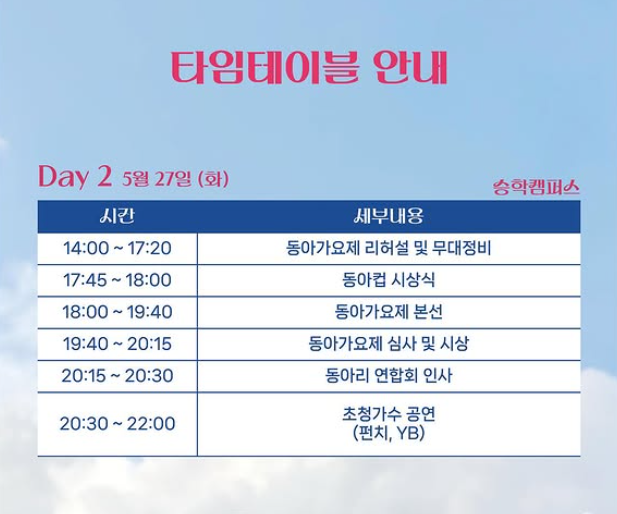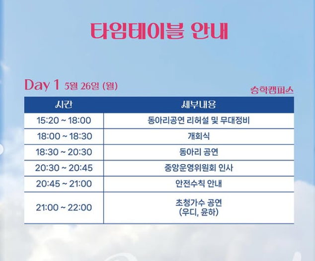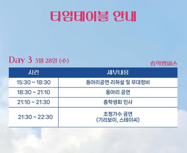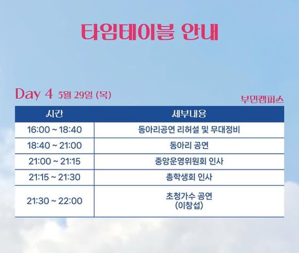 축제 일정은 5월 26일(월)부터 5월 29일(목)까지 총 4일간 진행되며, 매일 밤 다양한 가수들이 무대를 뜨겁게 달굴 예정입니다. 아래에서 자세한 타임테이블과 재학생 존 이용 방법까지 꼼꼼히 정리해드릴게요!