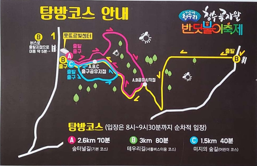 | A코스 | 2.6km | 약 70분 | 숲터널길 (기본 코스) |