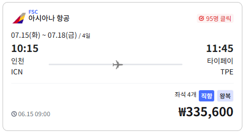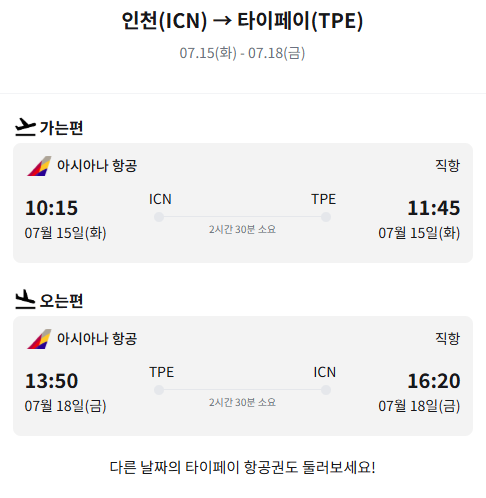 | 비행시간 | 10:15 인천 출발 → 11:45 타이페이 도착 |