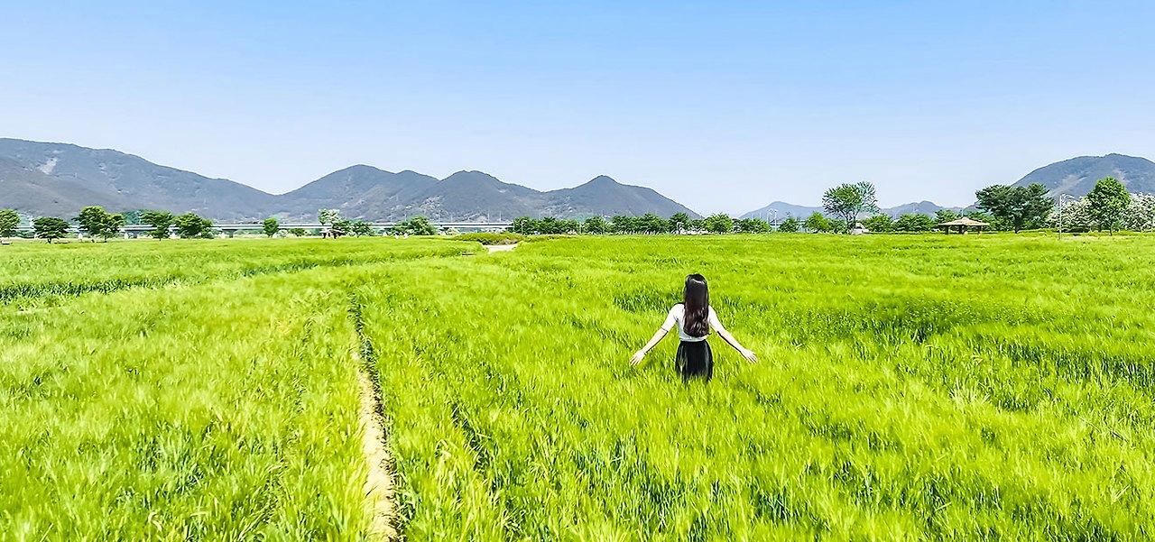 넓게 펼쳐진 푸른 청보리밭을 걸으며 자연의 힐링을 오롯이 느껴보세요. 쉼터와 포토존도 풍성합니다.