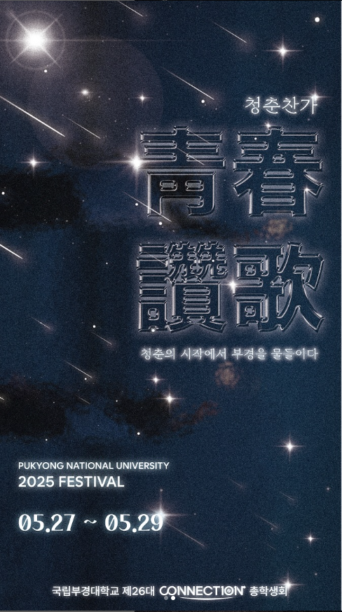 2025 국립부경대학교 대동제 ‘靑春讚歌(청춘찬가)'가 5월 27일(화)부터 29일(목)까지 부경대 대연캠퍼스에서 열립니다.