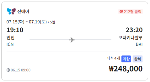 👉 212명 이상이 클릭한 인기 항공권! 좌석이 얼마 남지 않았습니다.